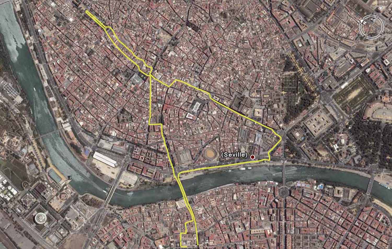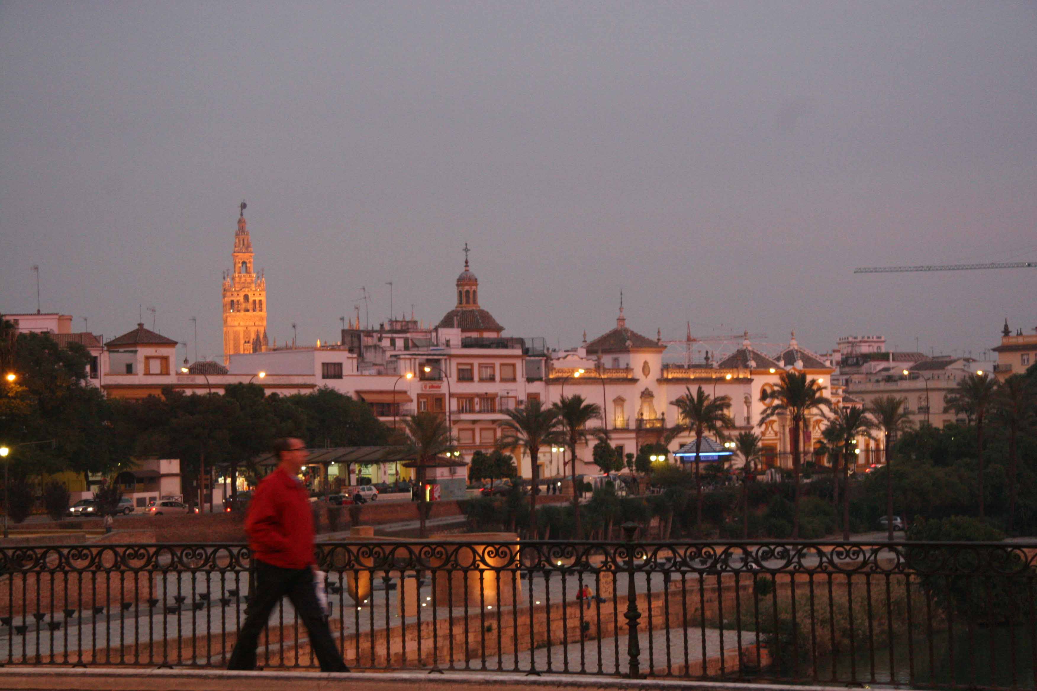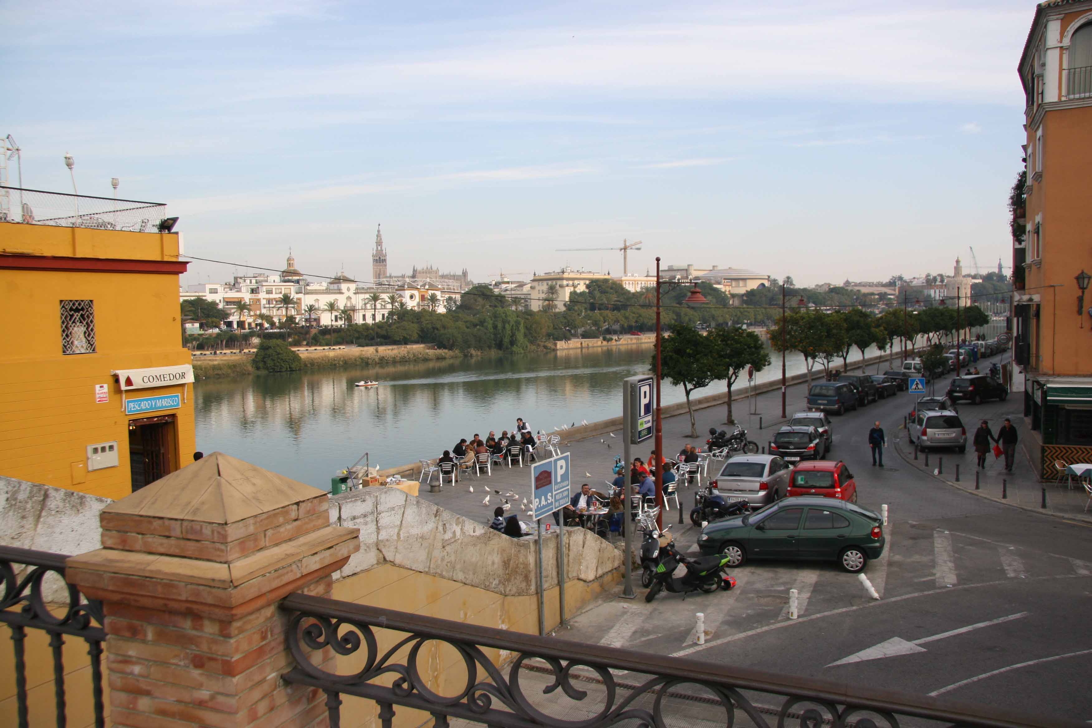 A look over the water to the center, can see La Catedral in the distance sitting just beyond the bull ring. This street is Betis Street, very popular for night-lifers